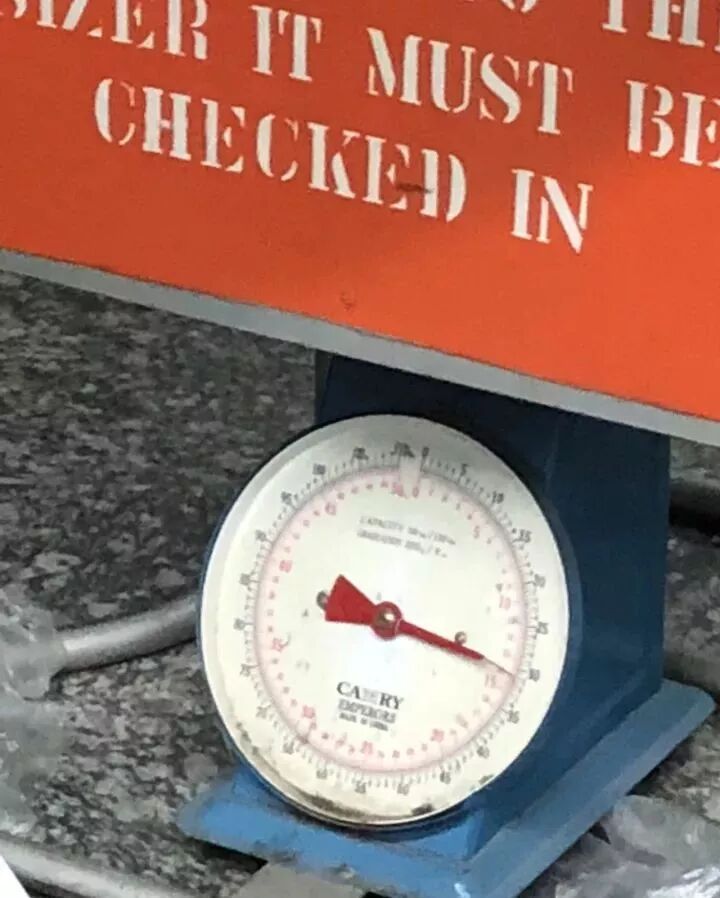 之后,他就用手指着刻度盘,说:“你看,我们的标准在这里,你箱子的指针已经到这里了!”然后迅速拿下了我的箱子。