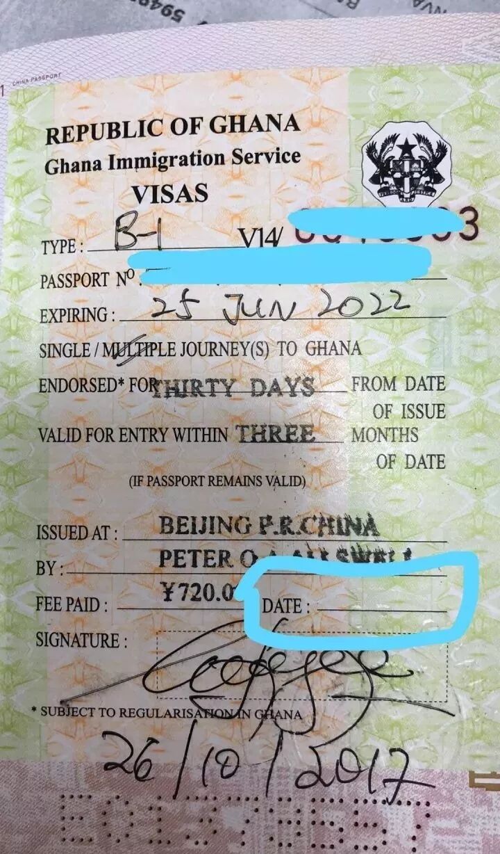 在查看我去加纳签证的时候,他看到生效日期一栏是空的,就问我为什么这里没有写日期?别人的护照都会有日期,你这里没有,所以你的签证是无效的。