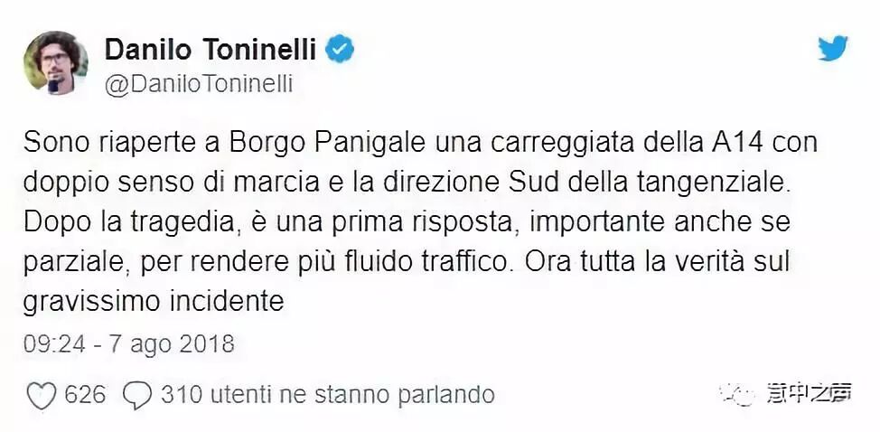 交通部长Danilo·Toninelli在表示:今天早上,Borgo Panigale这一路段目前已经开通了一条往意大利南部方向的双向应急通道。这是事故发生后我们的第一个紧急措施,虽然只是开通了部分路段,但可以让交通暂时恢复。