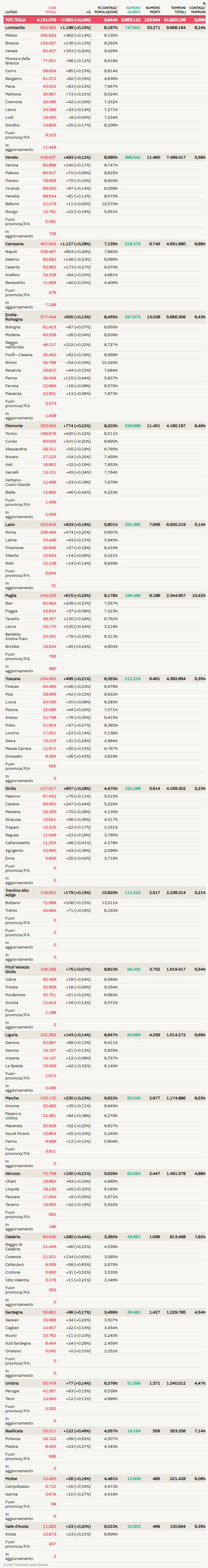 意大利确诊数据:累计确诊4.131.078人, 死亡123.544人, 治愈3.655.112人!