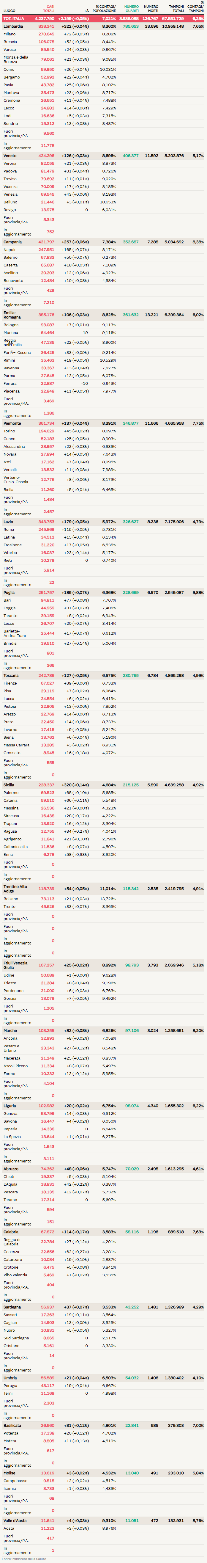 意大利确诊数据:累计确诊4.237.790人, 死亡126.767人, 治愈3.936.088