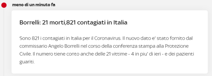 (视频)意大利沦陷:累计确诊888例,21死亡,46人治愈!官方出新算法!游客 2020-02-29 来源:劲爆新闻 阅读: 点击图片查看原文视频 天好0039意大利大全编译: 官方新算法,只公布现有确诊病例: 888-21-46=821例! (意大利大全 ITA0039 编译, 未经允许禁止转载) 最新进展,关注订阅号 为正常使用来必力评论功能请激活JavaScript (视频)天价口罩1000欧一个大发国难财,22人面临2年监禁的指控!... 点击图片查看原文视频 好0039意大...上一篇 (视频)Veneto大区疫情大爆发!各... 点击图片查看原文视频 天好0039意...下一篇 广告 BLUDATI 事业会计所 米兰办公室可直接办理公证手续(NOTAIO)!(广告)