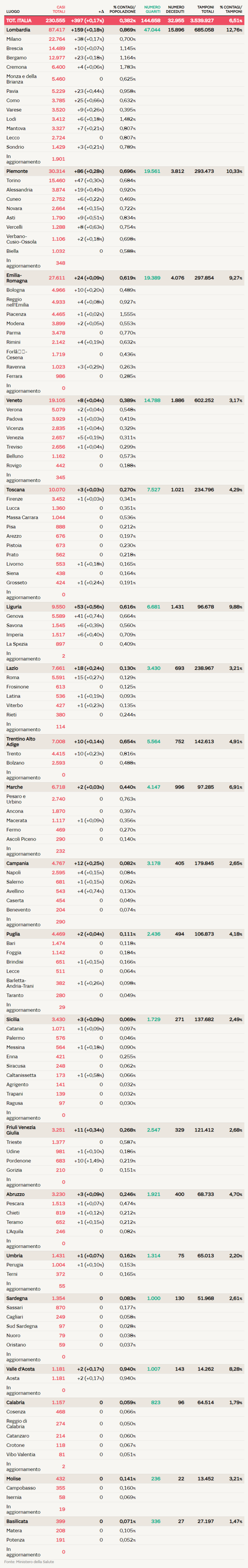 新“红区”的省份:Modena, Parma, Piacenza, Reggio Emilia, Rimini, Pesaro e Urbino, Venezia, Padova, Treviso, Asti, Alessandria, Novara, Vercelli e Verbano Cusio Ossola. (摩德纳,帕尔马,皮亚琴察,雷焦艾米利亚,里米尼,佩萨罗和乌尔比诺,威尼斯,帕多瓦,特雷维索,阿斯蒂,亚历山德里亚,诺瓦拉,韦尔切利和韦尔巴诺·库西奥·奥索拉)