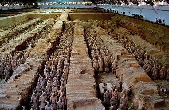 兵马俑是1974年当地农民在开凿水井时发现的。这些与公元前210年秦朝第一个统治者一起下葬的陶土俑是令人叹为观止的名胜。几千个真人大小的雕塑拥有各具神态的面部表情和标识他们等级的不同发型和铠甲。兵马俑博物馆坐落于陕西省西安市。