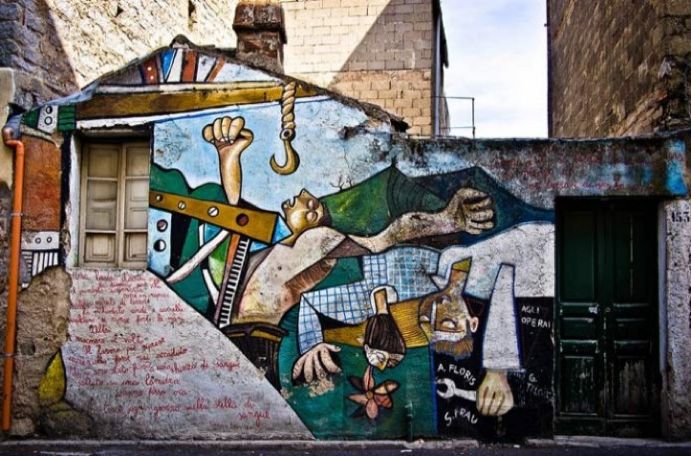 在这些壁画小镇中,其实菌菌最爱的是奥尔戈索洛(Orgosolo),对这里印象深刻是因为在十九世纪末,Vittorio De Seta在奥尔戈索洛拍摄了电影《奥尔戈索洛的强盗》(Banditi a Orgosol)。街道和广场,老城区的房屋和新建筑的墙面上…这里的壁画覆盖率非常高。