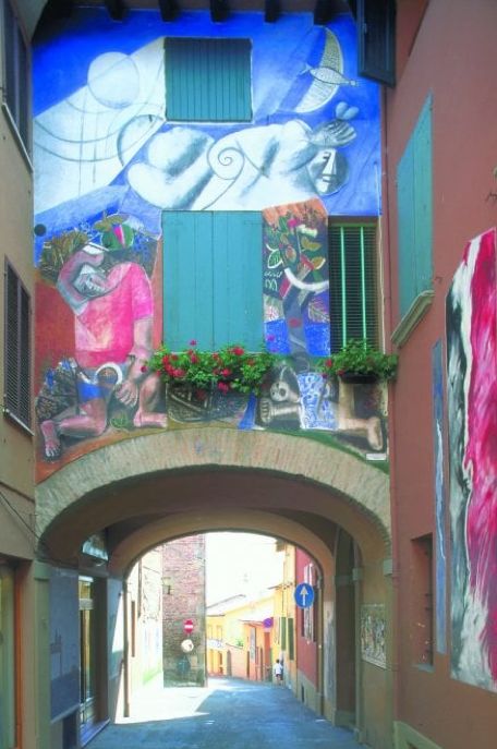 中世纪小镇多扎(Dozza)位于博洛尼亚的南部,被誉为百大“意大利最美丽的村庄”之一。1965年,多扎开展了第一届壁画双年展(Biennale del Muro Dipinto),自那以后,每两年(9月第三周)举办一次,邀请才华横溢的艺术家来此作画。
