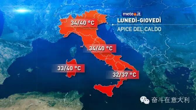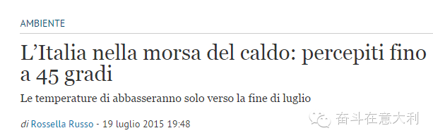 近日意大利的气温持续飙高,米兰市中心部分地区甚至高达摄氏40度,有人因受不了高温而死,农业和畜牧业更损失惨重。气象预报说,周末的雨势有助于降温,但随后会再回升。热浪发威,天气又热又闷。意大利“晚邮报”指出,一名男子可能因为受不了高温,在米兰的咖啡店里昏倒而死,急救人员量测他的体温高达摄氏44度。