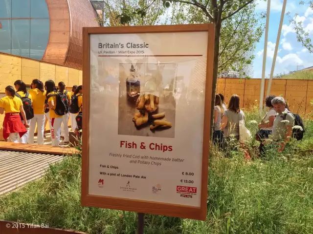 不得不黑英国,堂堂大英帝国首都伦敦也是米其林星级餐厅最多的城市之一了,但是本次世博会,为大家带来,当当当当,Fish&Chips! 哎,美食啊,加多5块钱还能有一品脱伦敦淡艾尔喝。哎,难怪上次食物最难吃国家的结果。。