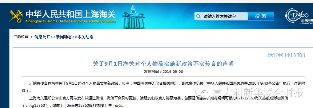 据意大利新华时报报道: 近日,微信圈再次疯传:回国注意啦,中国海关政策9月1日起有新变化!“9.1中国海关行李新政”(详细内容附后)从9月1日开始严格执行新海关政策,主要表达的意思有两点:一是超过了5000元人民币自用物品回国过海关的要征税,二是邮寄回国物品超过50元人民币开始征税。有许多关注《新华时报》微信平台的朋友纷纷留言这是不是真的!