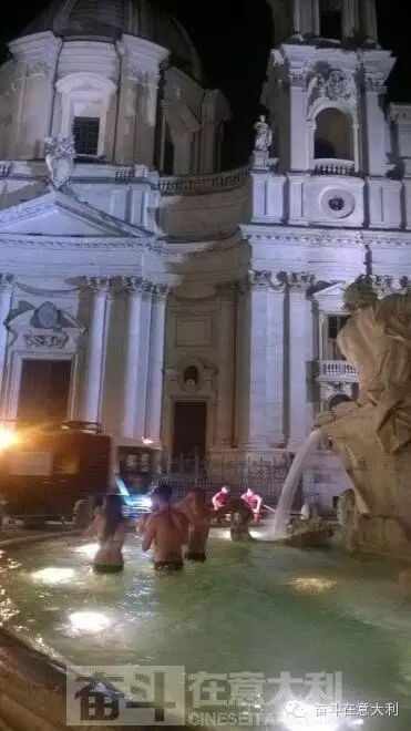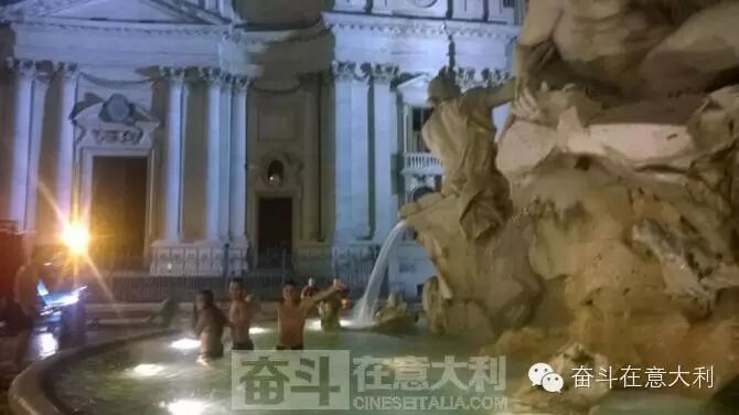 2015年7月13日凌晨3点,在罗马Piazza Navona喷泉处,来自美国的2名男性游客和一名女性游客在广场中的喷泉身着内衣玩耍。