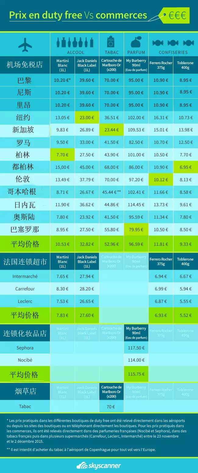 根据Skyscanner团队调查的数据显示,一瓶90毫升的My Burberry香水在机场免税店平均价格为96.59欧元,比在法国连锁化妆品店(平均价115.75欧元)便宜了约17%。万宝路(硬金)卷烟200支装在机场免税店平均价格为52.96欧元,比在法国烟草店(70欧元)便宜了约25%。