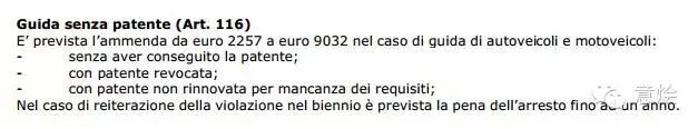 《晚邮报》1月12日消息,意大利交通法(116-XV号法令)规定,如果未通过驾驶考试就驾车在路面通行或携已过期、被吊销的驾照通行都是将被视为触犯意大利刑法,最高可判一年有期徒刑,并予以罚款,罚款金额:2257欧元—9032欧元。
