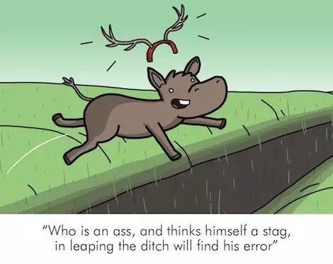 字面意思:以为自己是鹿的驴,会在跳跃坑沟时察觉真相。