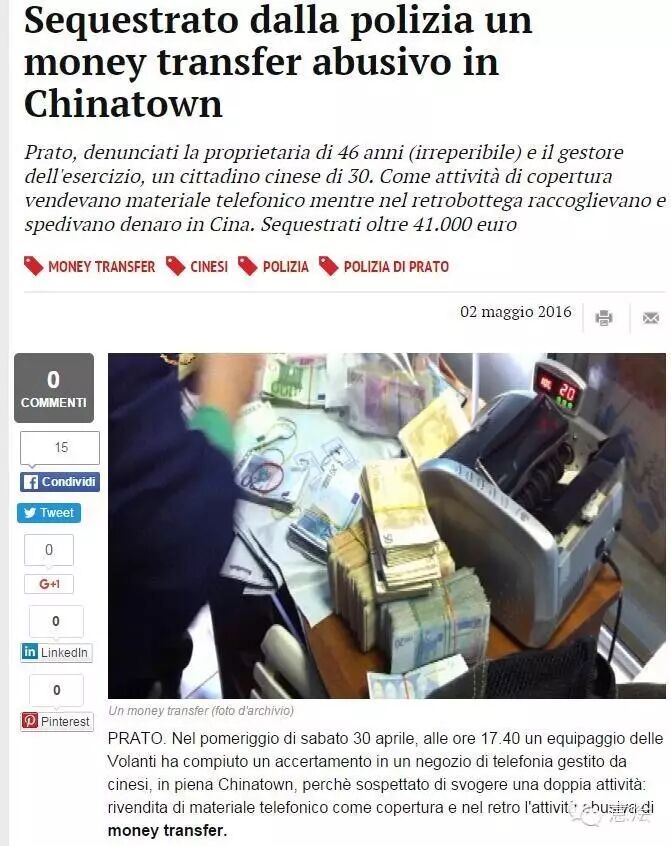 近日,普拉托一华人汇款公司被查,意警方表示该公司是一家手机配件店,但实际从事的却是“黑汇”工作(非法将钱从意大利汇往中国。)警方查获并扣留现金41750欧元。