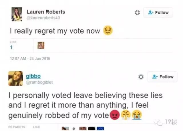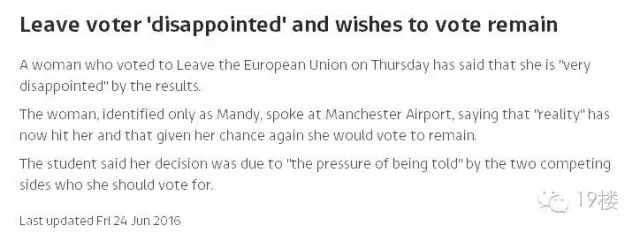 还有更让人哭笑不得的事情,在公投结束还没一天,已经有英国国民表示,现在后悔投了退欧的赞成票。