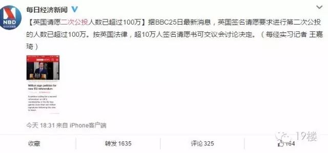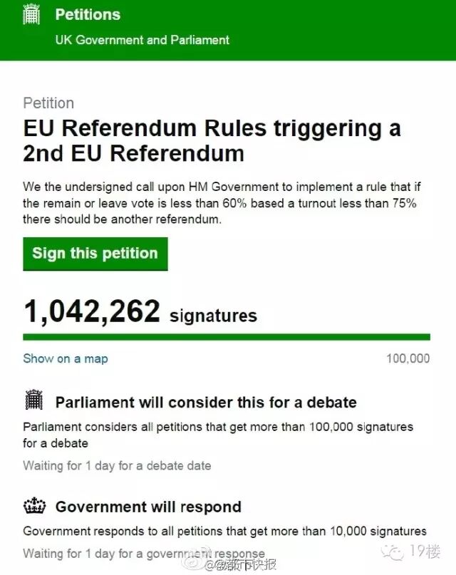 北京时间晚上6点多,请愿人数已经超过了100万...按英国法律,超10万人签名请愿书需交议会讨论决定。