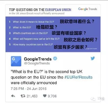 GoogleTrends统计显示,在公投最终结果公布2小时后,“如果我们离开欧盟会发生什么”这个问题的搜索量猛增2.5倍;在公投结果公布4小时后,“我们国家属不属于欧盟”这个问题的搜索量暴涨24.5倍。
