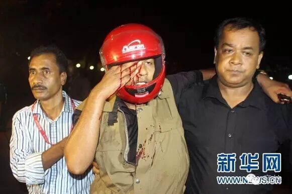 7月2日凌晨,在孟加拉国首都达卡,人们转移袭击事件中的受伤警察 ▼