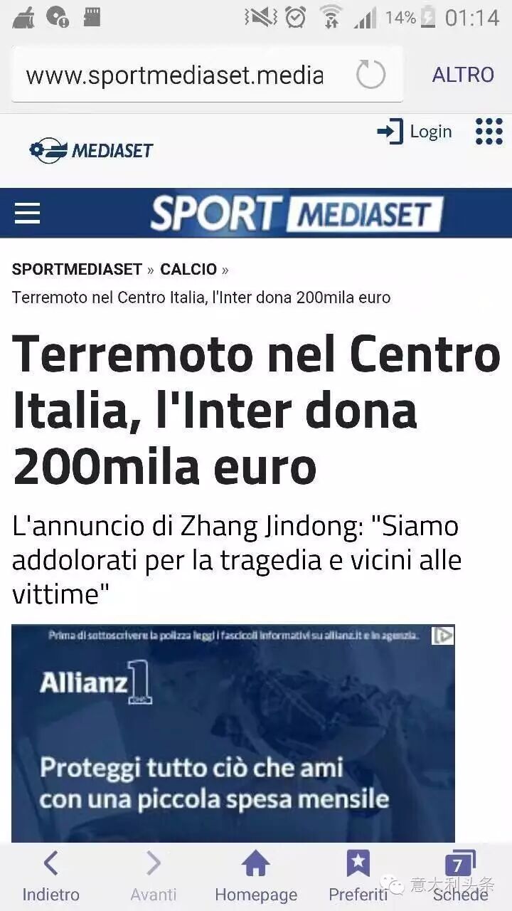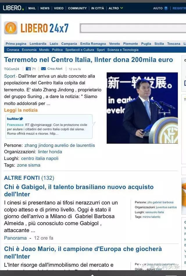 8月26日上午,根据意大利多家媒体新闻报道,国际米兰足球俱乐部新任掌门人张近东先生宣布为意大利佩鲁贾地震灾区捐助20万欧元,用以积极援助救灾工作。此事引起了意大利舆论的高度关注,并给予盛赞!