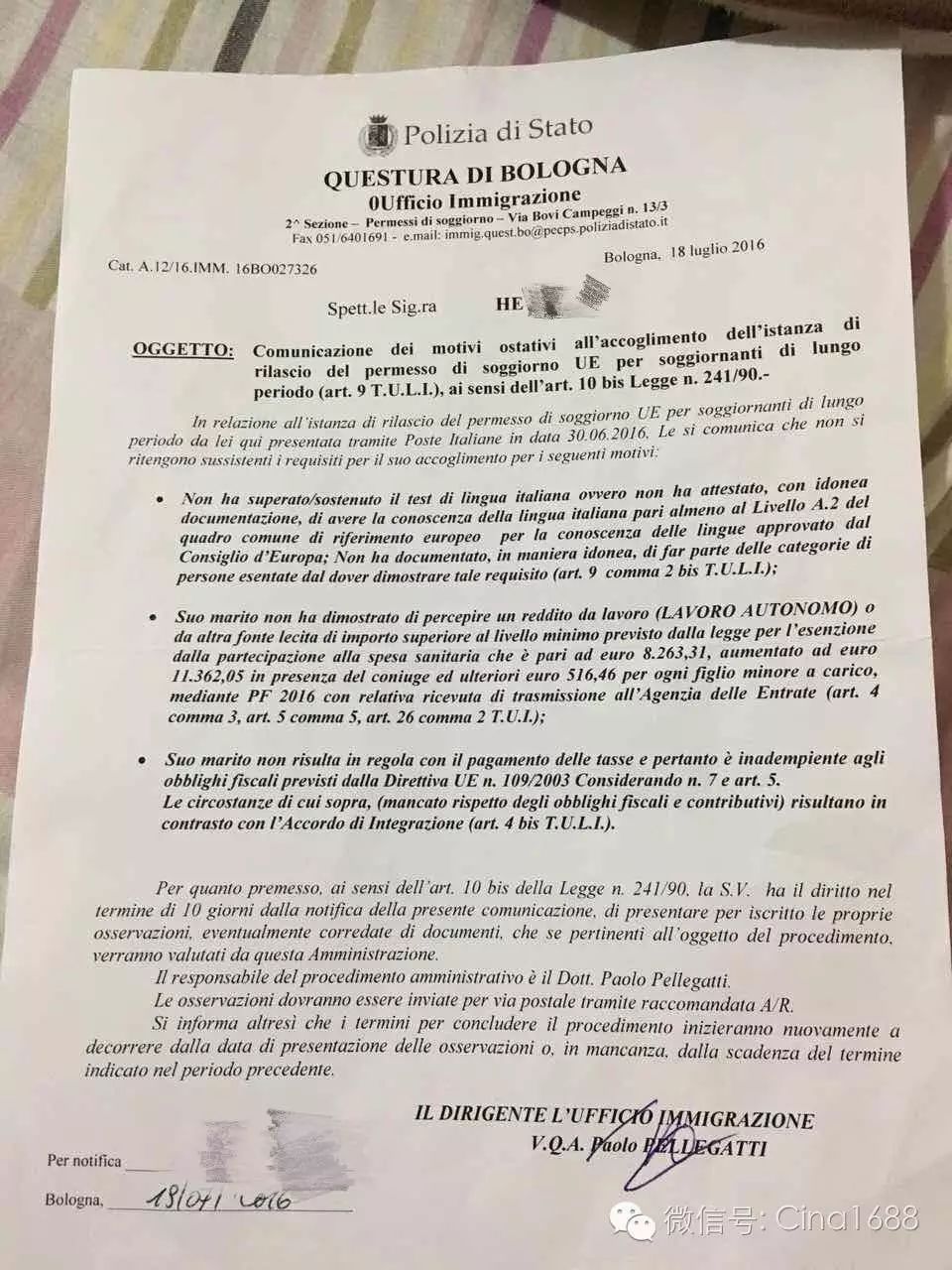 借登身份证的,也特别注意一下,近期有个朋友就一封挂号信没收,comune那边把 residenza自动取消了,你想想,那些已经寄了有2-3个月的都还没消息的,或者是在查居留的网站上看不到自己居留动态的时候,已经完了,有信寄来没收到,居留要被卡的死死的,或者是天天有看住查居留网的突然第二天就查不到的,那么要多多注意家里的信箱了。多数是审核差材料,寄信过来是要补材料或者是其他。