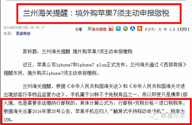 国内各大海关明确规定,携带iPhone7入境需要主动向海关报税,而税额是15%,也就是带一部最便宜的iPhone7回国也需要缴纳15%的税额!