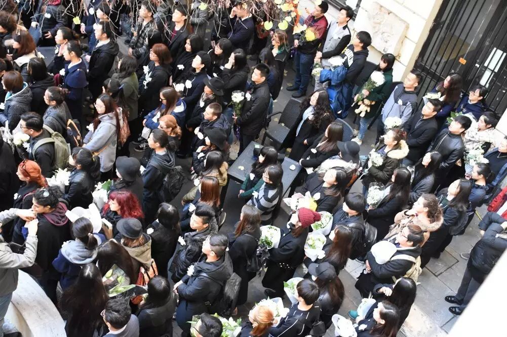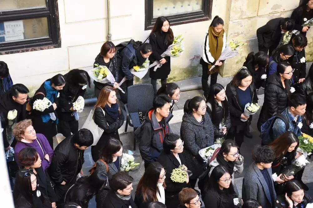 悼念现场,大家自觉的围在一起,罗马美院学校庭院已水泄不通,在走廊上大家自觉的排起长队。