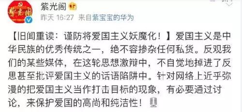 3月2日,中共中央国家机关工作委员会《紫光阁》杂志社也在微博发文,呼吁“谨防将爱国主义妖魔化!”