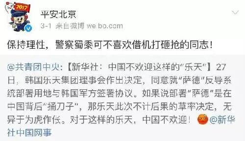 从中国网民到企业,这场前所未有的“抵制乐天”的集体行动,虽然显现着一波波高涨的爱国主义情绪,但人们也似乎前所未有地保持着克制。当乐天让地“萨德”的决定尘埃落定后,3月1日,北京市公安局官方微博@平安北京就针对抵制乐天的行动作出呼吁:“保持理性,警察蜀黍可不喜欢借机打砸抢的同志!”