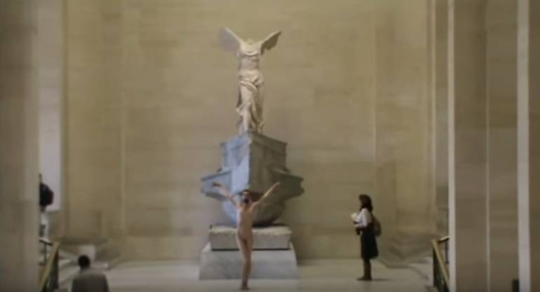 惊诧之余,很快有人发现此人甚为“眼熟”,原来他是西班牙行为艺术家Adrián Pino Olivera。上月22日,哥们儿刚在法国卢浮宫进行了好一番“表演”。