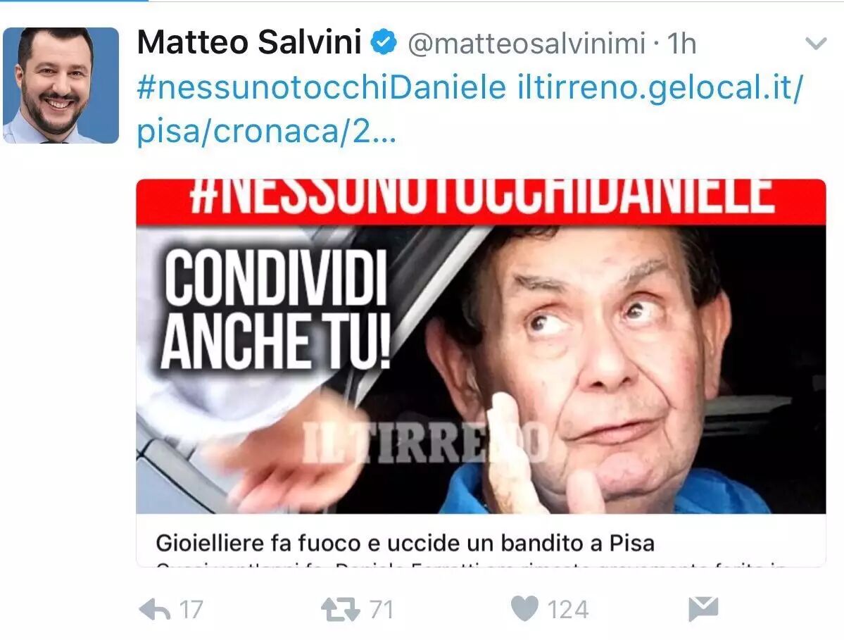 Movimento Nazionale党党魁Gianni Alemanno则在其个人社交网络上表示:“Daniele Ferretti在遭受过数次抢劫后,持枪反击劫匪。任何人都不应该调查他,自我防卫永远都是合法的。”