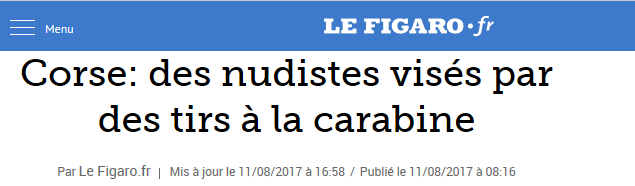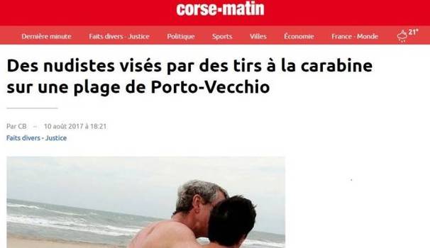 上周三(9日),在科西嘉岛一处名为Carataggio的海滩上,几位“裸晒爱好者”正趟在沙滩上肆无忌惮地享受着阳光。这时,附近一家餐厅的老板突然冲向他们,举着一把猎枪向人群射去。这名餐厅老板本来是想吓唬吓唬裸体人群并驱赶他们,不料一名意大利女子在混乱中被射伤。