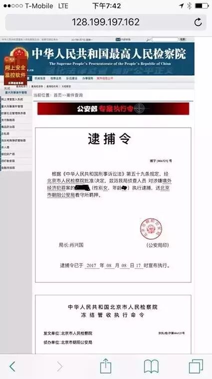 这个时候,他又出示了一份网页版的“逮捕令”。网页上居然赫然写着“中华人民共和国最高人民检察院”,公章和局长的名字齐全。