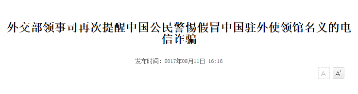 外交部也于近期发出提醒,中国公民警惕假冒中国驻外使领馆名义的电信诈骗。