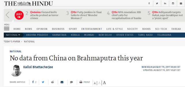 就在中印洞朗对峙持续超过两个月,《第一邮报》、《印度教徒报》等多家印度媒体报道:今年中国未向印度提供布拉马普特拉河(水文)数据。
