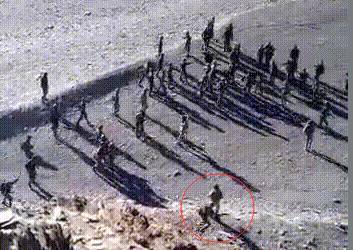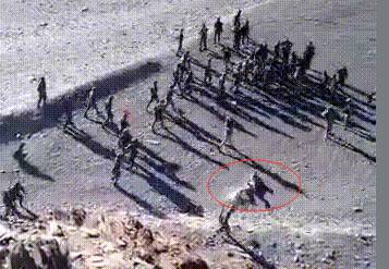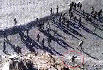 左侧是解放军,右侧是印军。此时一个印军士兵占据制高点位置,向解放军一猛砸石头。