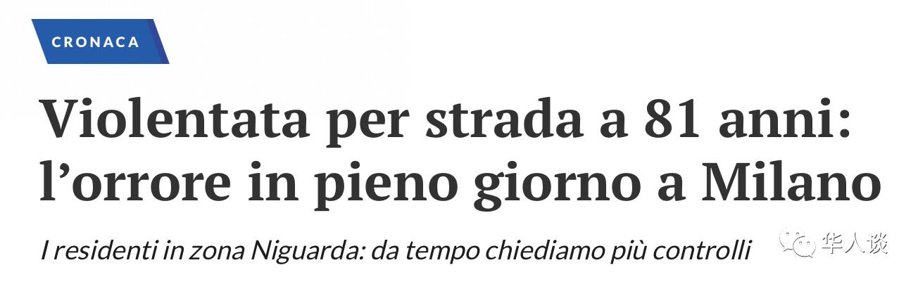 米兰Niguarda的居民一直抱怨这篇区域缺乏控制,安全性差。甚至在白天能够发生这种老人被强奸事件,这让所有民众更加不安。 (华人谈)