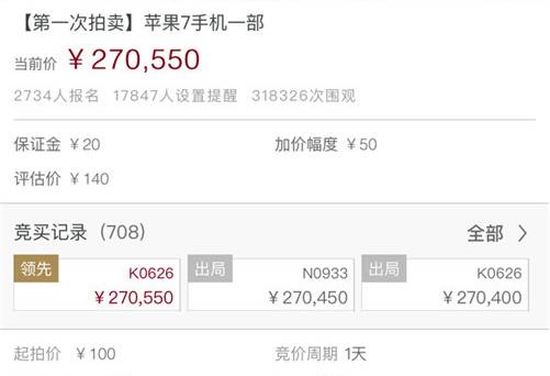 12点半左右,经过708次出价、377次延时后,拍品最终尘埃落定,价格锁定在27.055万元。系统页面显示,编号为K0626的竞买人车先生胜出。随着手机拍卖价格的节节攀升,到拍卖结束时,总围观人数超过了33万。