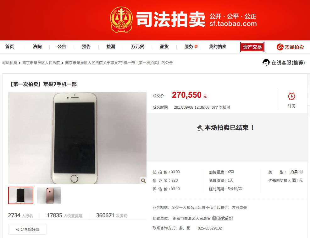 车先生说,他就是想买一部手机,在上网时,这部手机正好在首页,他就注册账号开始竞拍。“我中午吃过饭点进去,看到一部iPhone7手机,一直把价格看成2000多元。拍下来以后,我都惊呆了,一部手机怎么能是这样的价格?”车先生说没有人和他联系,他按照淘宝给的联系方式打法院的电话,但一时半会也打不通。“我肯定不会把它买下来,现在头痛得要命,准备先和法院联系一下。”