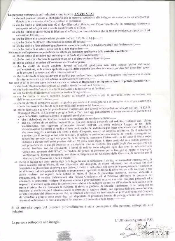 回家给懂的人一看,这不对劲啊!就拿着verbale去警察局讨说法:你说不是罚款不用钱,这上面写着罚款2000坐牢一年是什么?找律师不用钱吗?警察说:如果你的 redito 10700 以下找律师不用钱,国家帮你付钱。我只能笑笑,哪有那么多时间去找什么律师,你要的居留我带给你了,你看,这是我的永久居留。可是警察连看都不看,说没用,verbale已经开了取消不了,你尽早找律师吧。我说你这是种族歧视,你们不可以这么做。我在意大利这么久,几次钱包没带都没事,最多一次钱包没带忘家里,驾照没有,罚了28块钱。可我这回所有证件都带了,就没带居留,你居然还告我!我连听都没有听过,出门我带了所有证件还不能证明我是合法移民,你偏偏要居留,你打个电话问问总部不就知道,我有没有居留了吗?