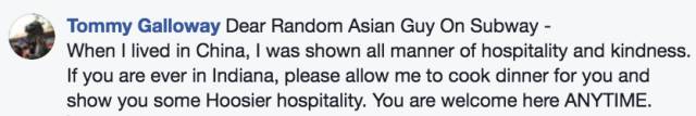 这位亲爱的亚裔友人,请你不要因为这一次偶然事件就对所有的美国人都失望了。我曾经去过中国,那时候,我被你们的文明和礼节所感染。你们要相信,在美国,你们是随时被欢迎的!