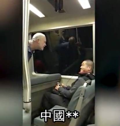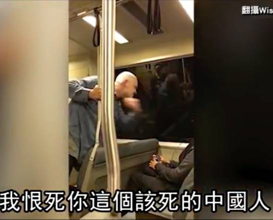 视频显示,一名美国白人男性站在车厢内,朝着坐在旁边、戴耳机听音乐的华人,大爆粗口:
