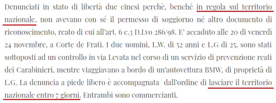 cremonaoggi.it网报道,11月24日,在克雷莫纳省(Cremona)科尔泰德夫拉蒂(Corte de Frati)市,两名华人男子因没有随身携带证件而被宪兵警察下达了驱逐令。据悉,两名华人男子年龄分别是52岁和25岁。当晚20时左右,两人正驾驶着一辆宝马轿车在via Levata街上行驶,被正在该处巡逻的宪兵拦下。宪兵以常规检查为由,要求两名华人男子出示证件,但后者既没有随身携带居留,也无法当场出示任何可以证明身份的证件。
