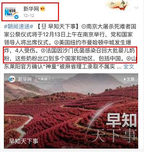 该公司已于12月10日宣布将会在全球范围内大规模召回产品,该公司旗下商品在中国有售!不过从最近的消息来看,该公司保证在中国区域销售的奶粉是未受污染的。