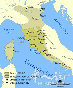 伊特鲁里亚文明(Etruscan civilization)存在于公元前12世纪至前1世纪,伊特鲁里亚的位置在包括了现今意大利托斯卡纳、拉齐奥、翁布里亚的区域。伊特鲁里亚被认为是伊特拉斯坎人的国家,后来被罗马人吞并了。古罗马的伊特鲁里亚时期是其鼎盛时期。伊特拉斯坎语不属于印欧语系,但是目前对这个语言所知甚微,尚未能破读。拉丁文的字母来自伊特拉斯坎字母。迄今为止,考古学界和历史学界都没有明确证实伊特拉斯坎人起源于何处。他们没有留下任何文学、宗教和哲学。伊特拉斯坎人早在前8世纪就到达了台伯河流域的北部地区,前500年左右又扩展到南部的坎帕尼亚和北部的波河流域。伊特拉斯坎人在半岛上建立起兴盛先进的文明,于公元前6世纪达至巅峰,在习俗,文化和建筑等诸多方面对古罗马文明产生了深远的影响,但其最终在罗马共和国时期完全被罗马同化。 早期罗马(王政时代)曾长期被伊特拉斯坎人所主导。公元前616年—前509年,罗马先后有三位来自伊特鲁里亚的国王。