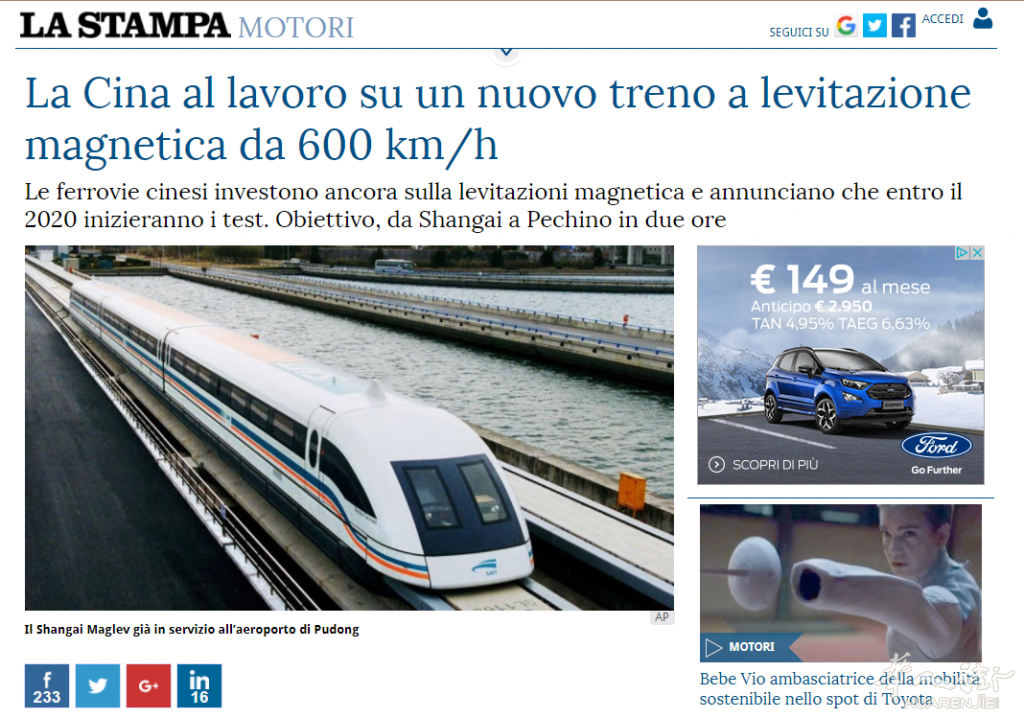 街友们,大家好!华人街小编编译的意大利新闻又来了,咱们中国新四大发明之一的高铁让世界为之瞩目,随着中国科学技术的不断进步,距离中国人坐上“超级高速列车”的日子也越来越近了。今天华人街小编编译的LA STAMPA上的报道如下: