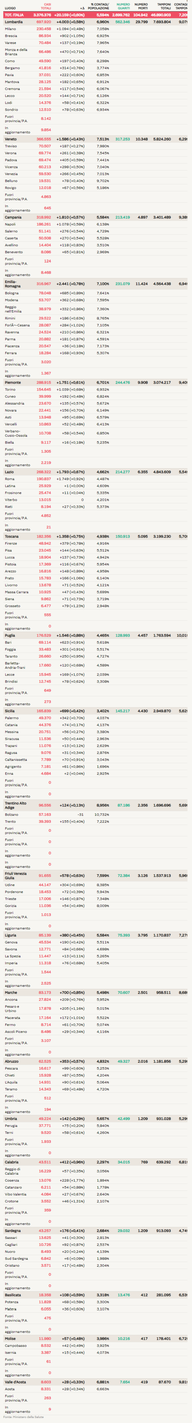 意大利确诊数据:累计确诊3.376.376人, 死亡104.942人, 治愈2.699.762人!