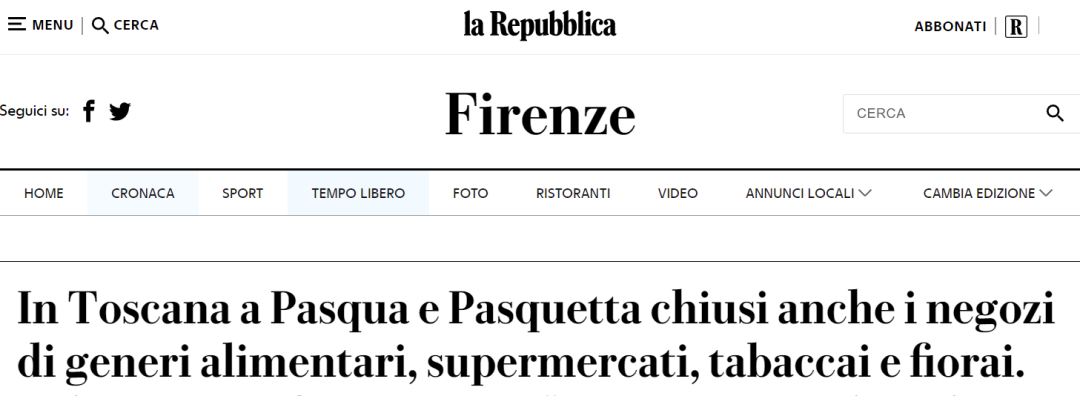 Toscana 大区特别情况:在复活节4月4号和5号,食品店,超市,烟吧和花店...等本在红区也可以开门的,在这两天都不可以开门。 请大家相互转告,那两天不要出门买菜了,一出门可能就要被罚了!
