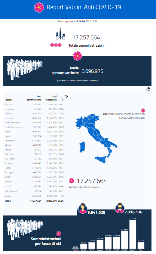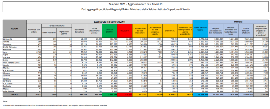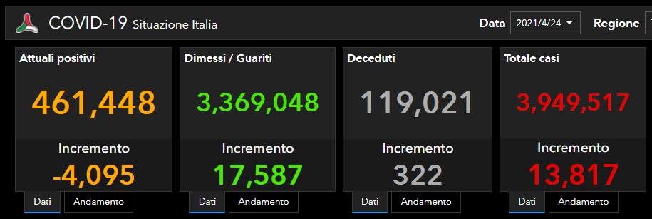 意大利确诊数据:累计确诊3.949.517人, 死亡119.021人, 治愈3.369.048人!