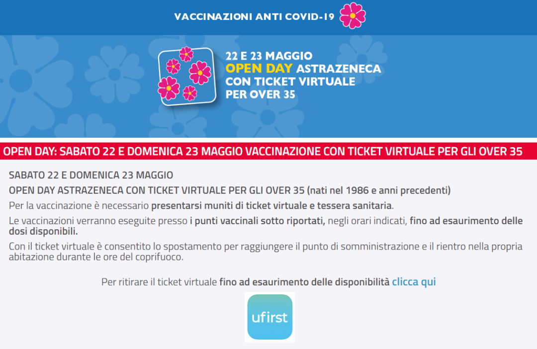 通知:今天5月22号和明天23号首都罗马所在的大区Lazio,这2天是疫苗开放日, 35岁以上(出生于1986年之前)的所有人都可以去打,无需提早预约!