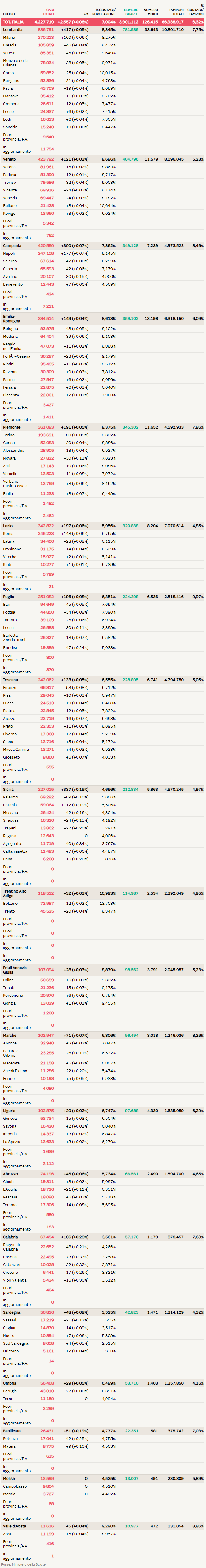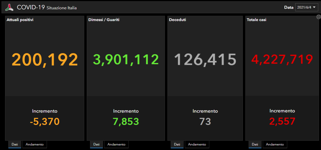 意大利确诊数据:累计确诊4.227.719人, 死亡126.415人, 治愈3.901.112人!